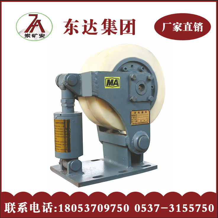 滚轮罐耳为一种立井提升容器用滚轮罐耳,其结构由底座、摆转臂、滚轮、缓冲器组成;滚轮罐耳结合我国矿山特点为目前运行中的提升容器更换新型滚轮导向装置提供了便利条件,广泛应用与矿山,煤炭等工业生产部门。罐道与罐耳由滑动摩擦变为滚动摩擦,因此减少了动力消耗,降低了噪音,罐道和罐耳的磨损也大大降低。从而,提高了罐道和罐耳的使用寿命。